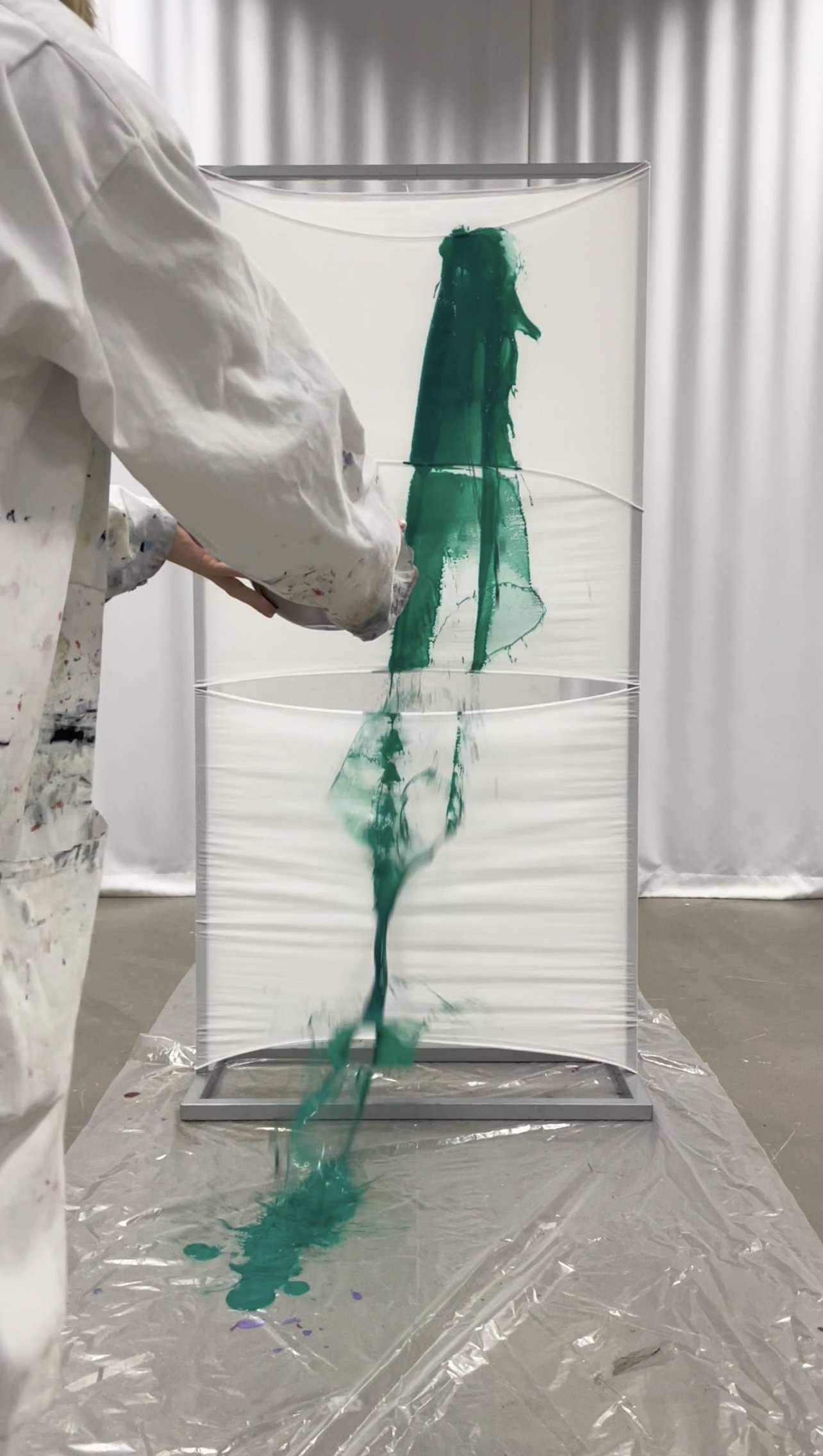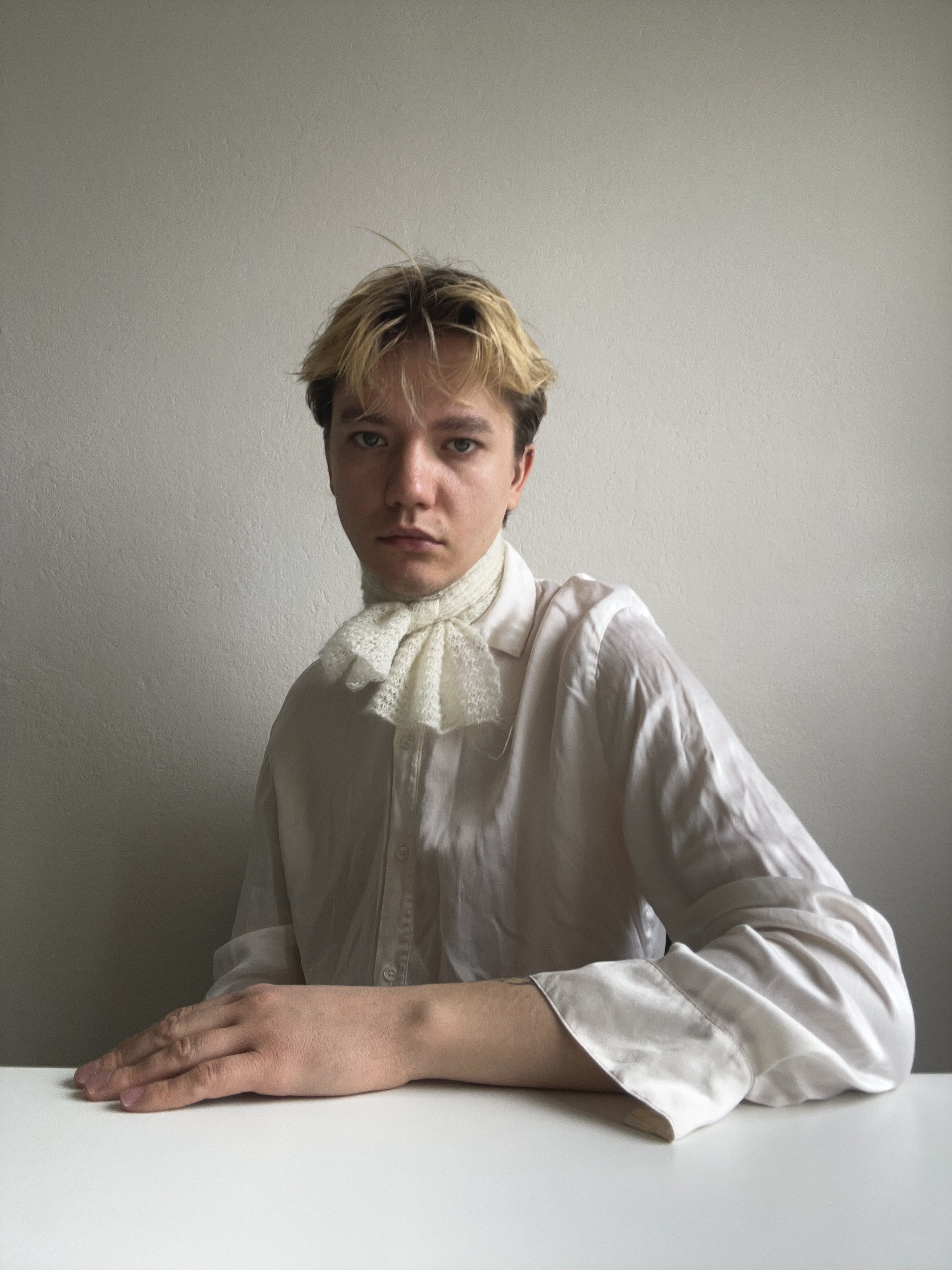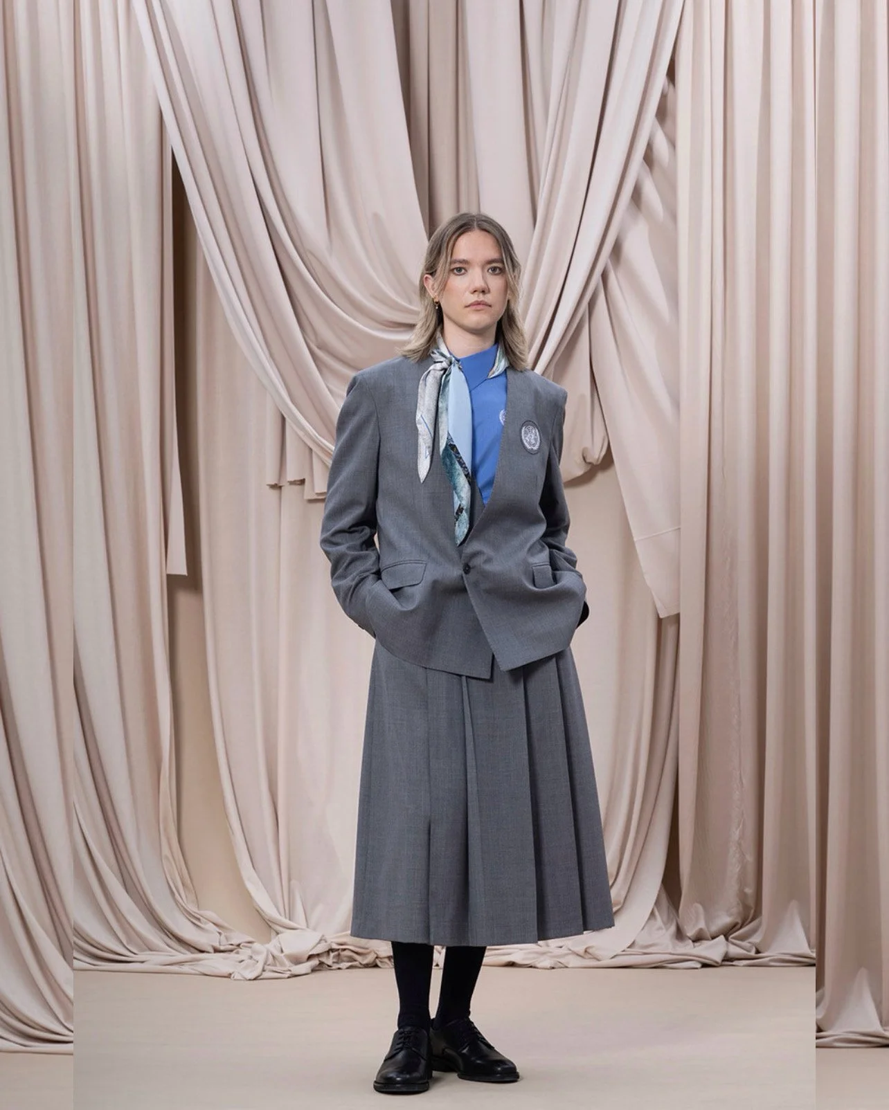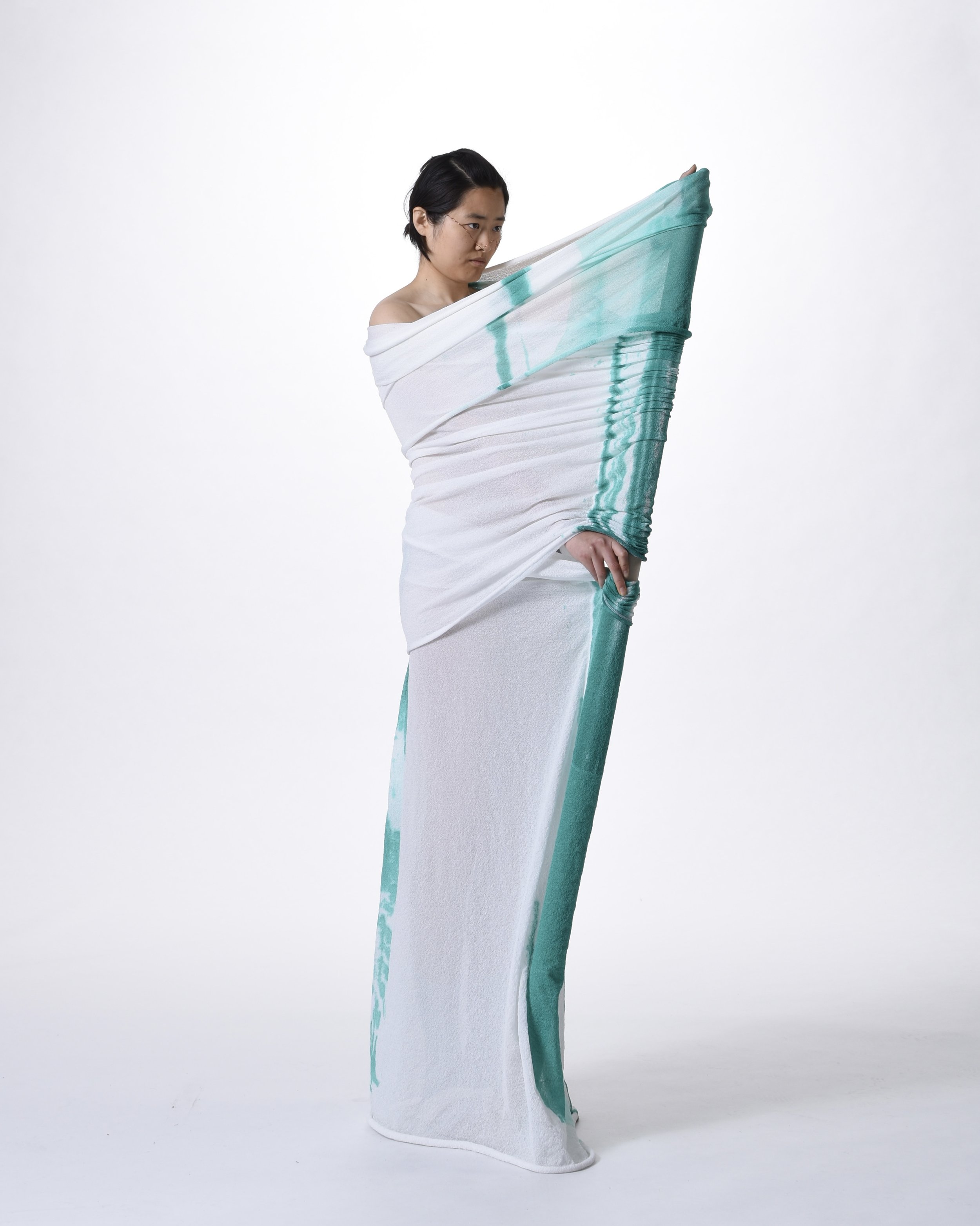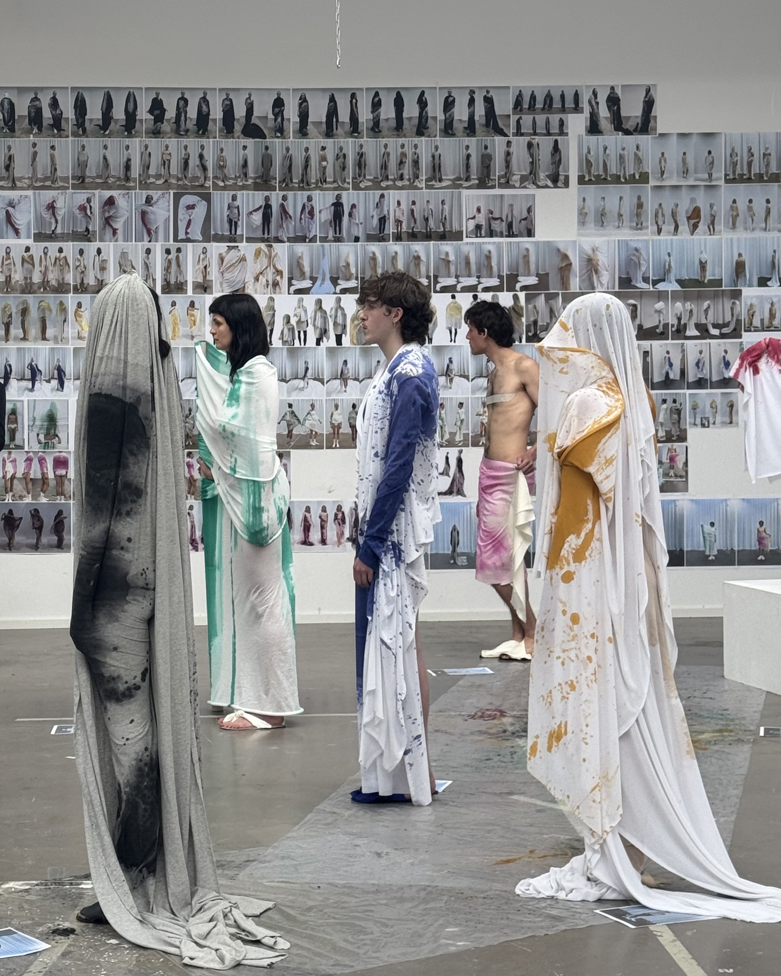 For his masters collection titled “Liquid Relics”, he chose to focus on draping and the idea of stains. Not as a flaw, but as a subject. "I looked at stains - what they are, what they mean. I explored it in two contexts. One was more religious or historical, where certain stains are considered sacred, like the Shroud of Turin,carrying a completely different emotional weight. And then there's a stain like coffee on your shirt, which is perceived very differently. That contrast really interested me, and I built my whole project around it." The programme required the work to be grounded in theory as much as in practice: a written thesis, a defined method, and an argument for how that method could extend beyond the project itself. Context, for him, became essential. "I always try to give my work a context," Without it, he suggests, you're working somewhat blind, making without knowing why. "I believe that if your work has context, it can more easily become universal. And if you understand the context of what you're doing, you can also break away from it and consciously try something new."